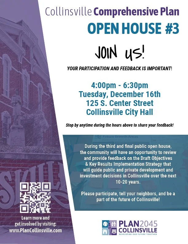 During the third, and final, public open house, the community will have an opportunity to review and provide feedback on the Draft Objectives & Key Results Implementation Strategy that will guide public and private development and investment decisions in Collinsville over the next 10-20 years. Kids are welcome!